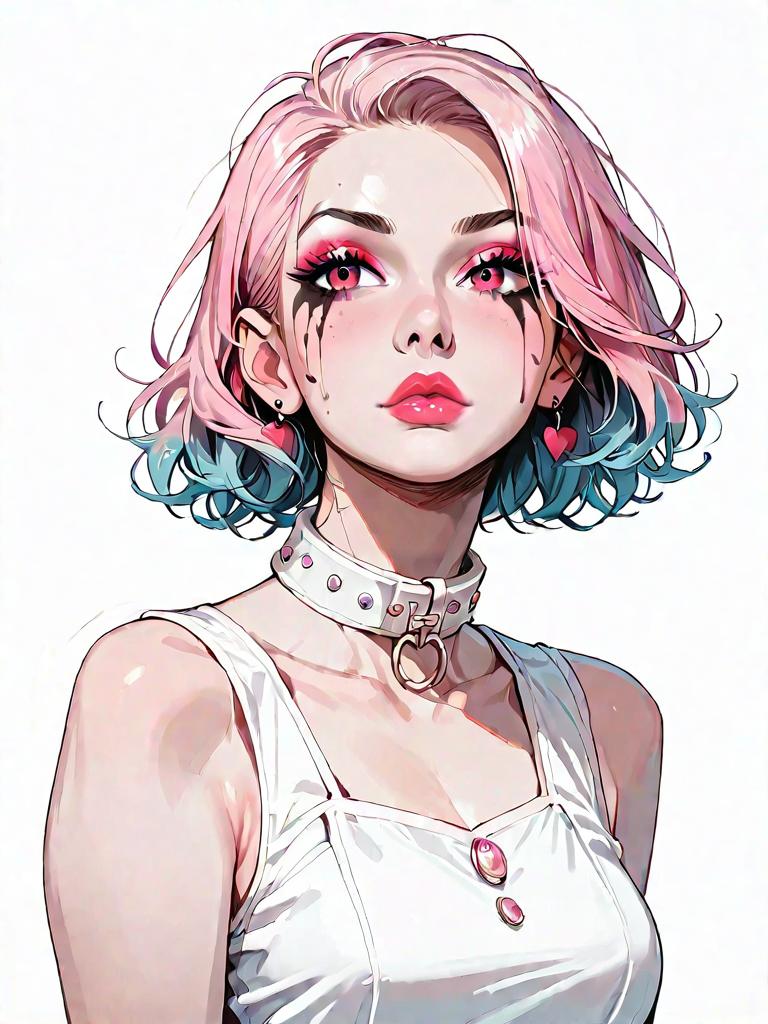 Digital illustration of a young woman with short pink hair fading to blue tips, wearing a white sleeveless top and a white choker necklace with a heart-shaped ring. The woman has striking pink eyes with dramatic black eye makeup that appears to be running down her cheeks. She wears pink heart-shaped earrings and has a minimalistic yet bold fashion style, portrayed against a plain white background.