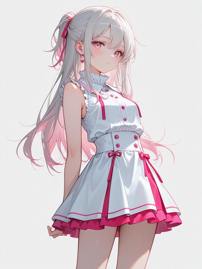 Contrasting white collar, sleeveless, high-waisted flared miniskirt in matching pink, minimal makeup, simple hairstyle with half-up, half-down look, plain white background.