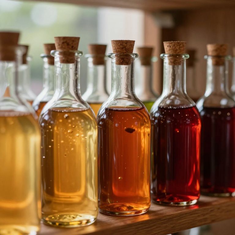 Photograph of six clear glass bottles with cork stoppers, each containing different colored liquids: yellow, amber, orange, red, and dark red. The bottles are arranged in a row on a wooden shelf, with a blurred background of soft, natural light. The liquids inside are transparent with visible bubbles, and the varying colors create a visually appealing gradient. The wooden shelf has a rustic texture, and the corks are natural, adding a touch of earthiness to the scene. The overall composition is warm and inviting, highlighting the diversity of the liquids.