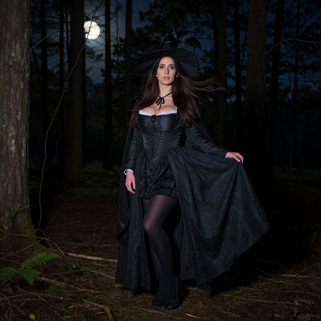 A dramatic photo of a woman in an authentic Salem witch costume standing in a moonlit forest clearing on the outskirts of Salem, Massachusetts, with dense pines surrounding her, her outfit complete with a dark gown, black tights, and a raven-feathered hat, her face illuminated by the soft moonlight, with deep brown eyes and a subtle knowing look, the wind gently moving her cloak. The woman has big tits and cute face