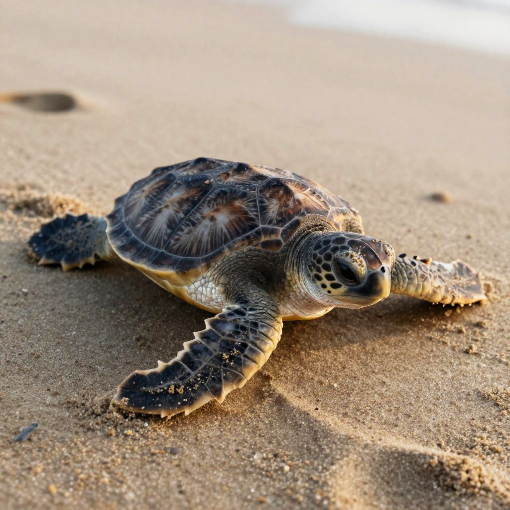 Detailed realistic baby sea turtle drawing crawling on a sandy beach, intricate shell pattern and skin wrinkles shown with precision, early morning light casting soft warm tones, footprints and grainy sand texture add natural realism, artistic yet highly true to life.