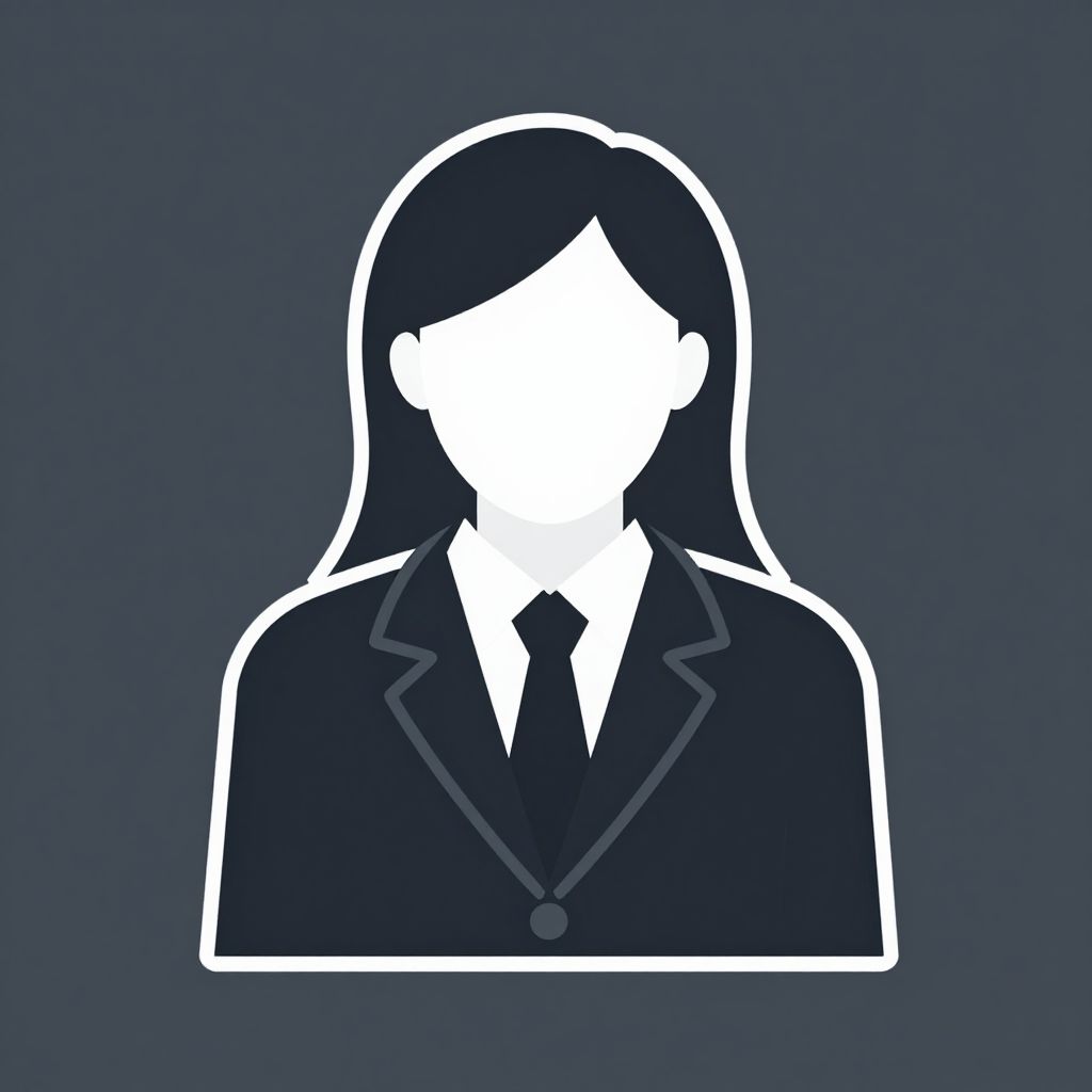 This is a digital, minimalist, silhouette-style illustration of a person. The image features a white, faceless outline of a person with long, straight hair falling to the shoulders, set against a solid dark blue background. The person is wearing a formal dark blazer with a white shirt and a dark necktie. The blazer has a distinct lapel, and the tie is centered. The outline is clean and simple, with no additional textures or details, emphasizing the formal attire and the faceless, anonymous nature of the figure. The overall style is modern and minimalistic.