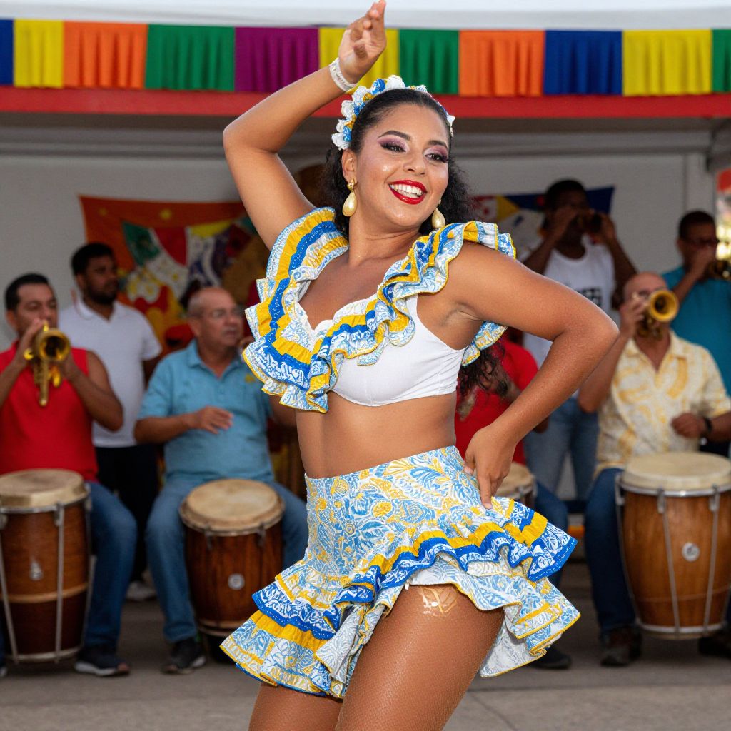 High-definition photo of a playful Dominican merengue dancer in a short ruffle dress, full of energy, her face glowing with a warm, radiant smile, dancing confidently under a colorful banner at a local festival, the vibrant music from the drums and trumpets filling the background, perfectly capturing the 'woman costume, Dominican merengue dancer, short ruffle dress playful' essence in a real-life cultural setting.. The woman has big tits and cute face