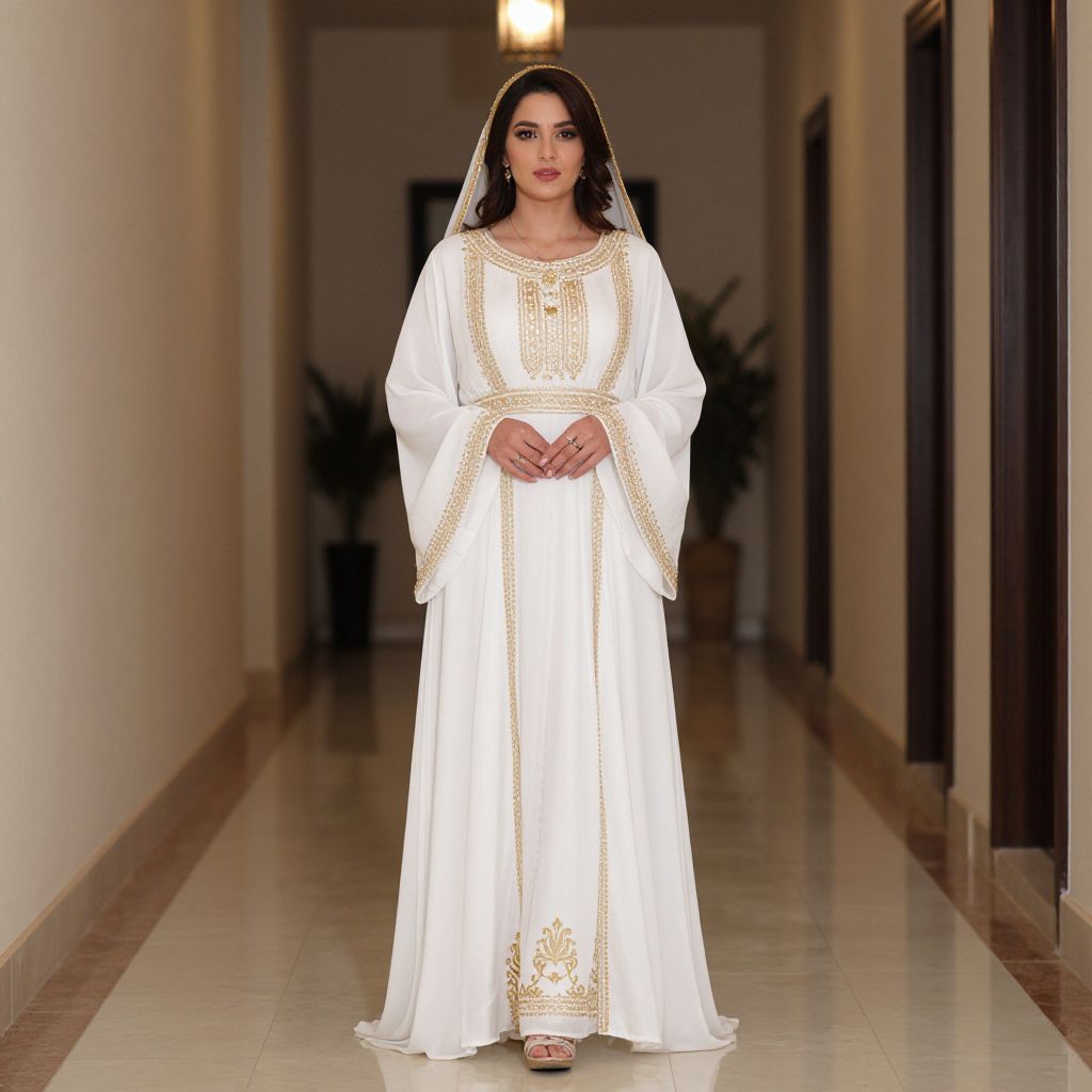 Middle Eastern Woman Clothing Costume, a woman in a white dress standing in a hallway