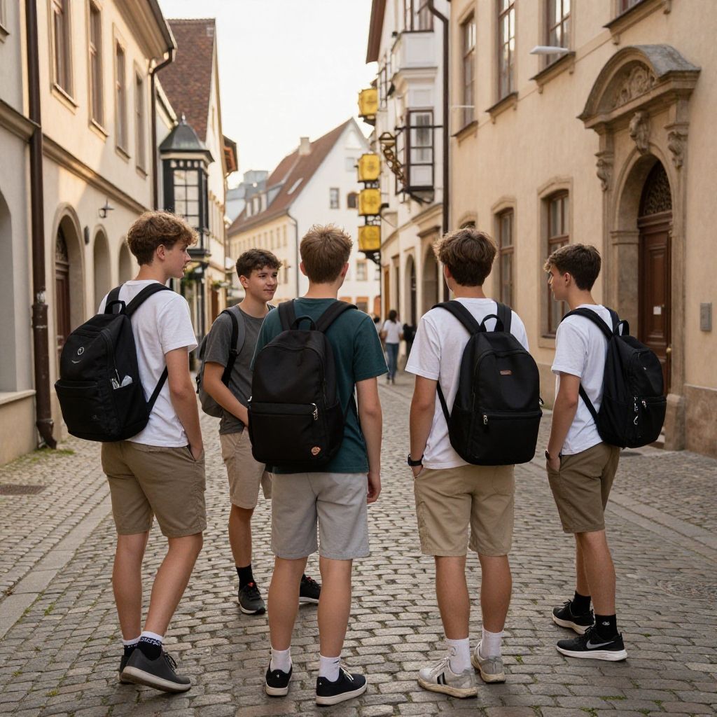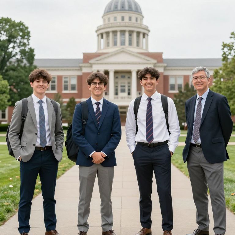 Four males, including three teenage students and one adult male teacher or faculty member, standing on a paved pathway in front of a large academic building with classical architecture and a dome. The students wear ties and formal attire with backpacks, while the adult is dressed in a suit jacket and tie. The setting is an outdoor green campus environment, likely at Proctor Academy, a private boarding school.