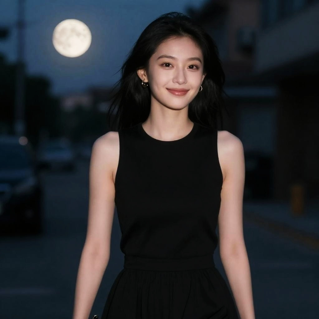 ((upper body:1.2), nikon RAW photo, 8 k, Fujifilm XT3, masterpiece, best quality, realistic, photorealistic, ultra detailed, extremely detailed face, small smile, solo, 1girl, standing, fashionable and trendy atmosphere, and a stylish expression on her face, close up, black dress, walking, at the dark streets, moonrise, sleeveless, fabric clothes