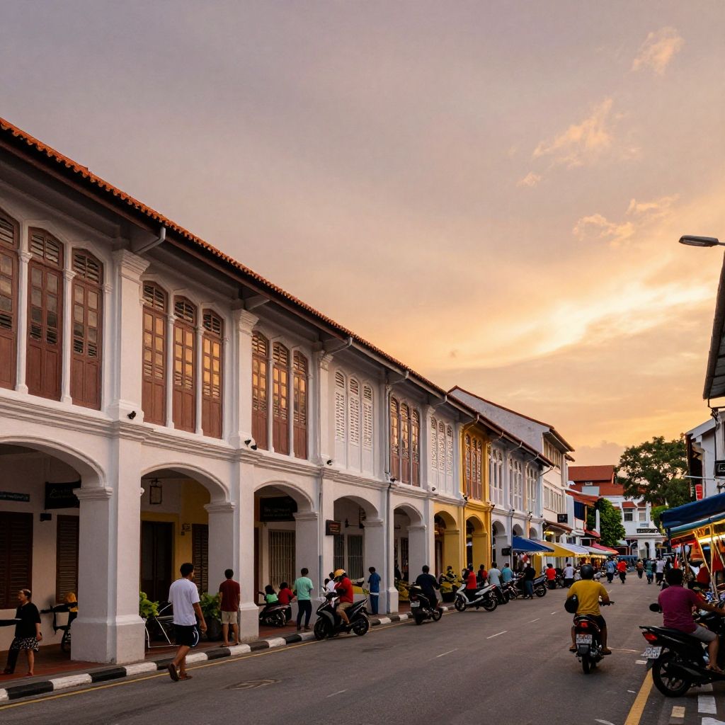 Architecture, building, (shophouse), cityscape, scenery, Southeast Asia, George Town, Penang, vintage, historical, heritage, orange tiled roof, pedestrian arcade, narrow facade, long windows, people, crowd, street vendors, road, perfect proportions, perfect perspective, 8k, masterpiece, best quality, high_resolution, high detail, photorealistic, motorcycle, bike, CyberpunkWorld, nightmarket, sunset