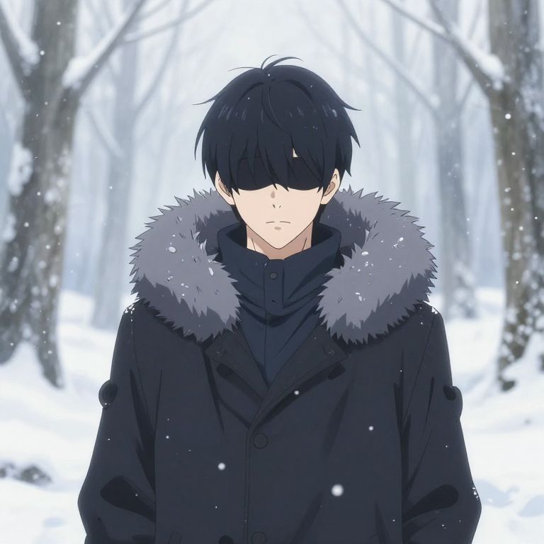 Anime male black hair covered eyes, standing in a quiet snowy forest clearing, snowflakes drifting gently, soft white and blue color scheme, minimalist background, deep contemplative mood, detailed fur-lined coat, expressive yet subtle anime art style.