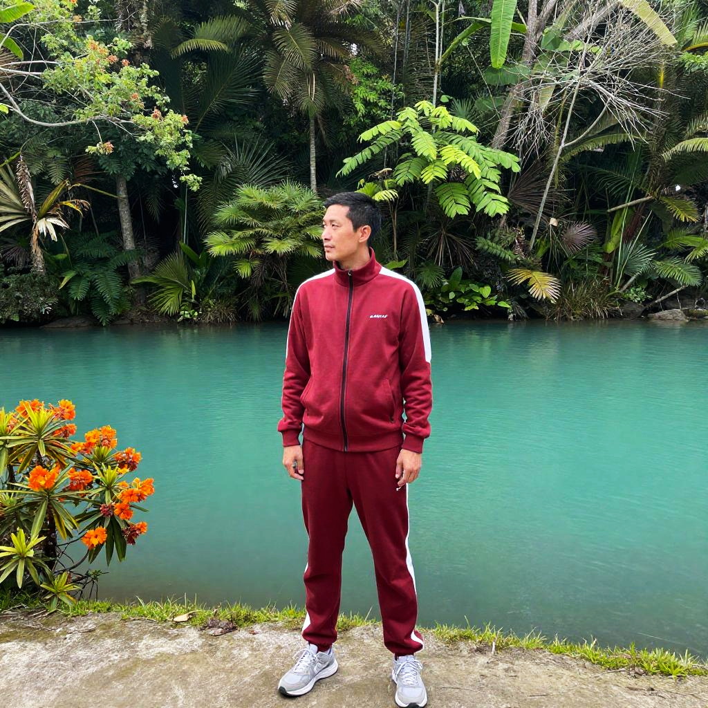 A man stands by a vibrant turquoise lagoon surrounded by lush tropical foliage, wearing a casual red tracksuit and sneakers. The serene environment is perfect for a leisurely day out, showcasing a blend of nature and relaxation. The bright flowers add a splash of color to the idyllic setting.