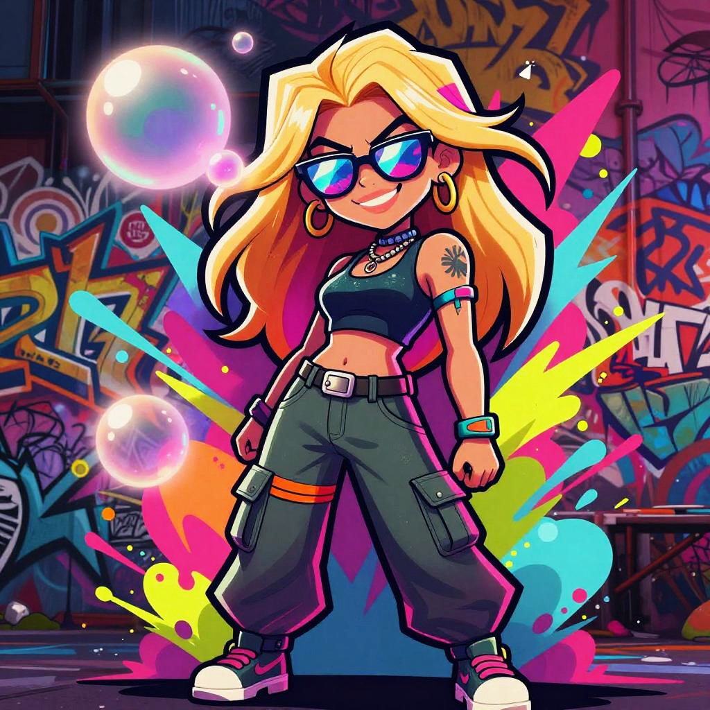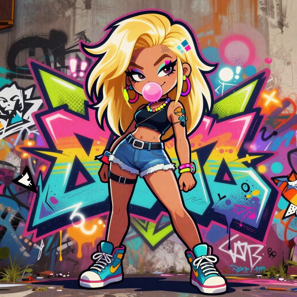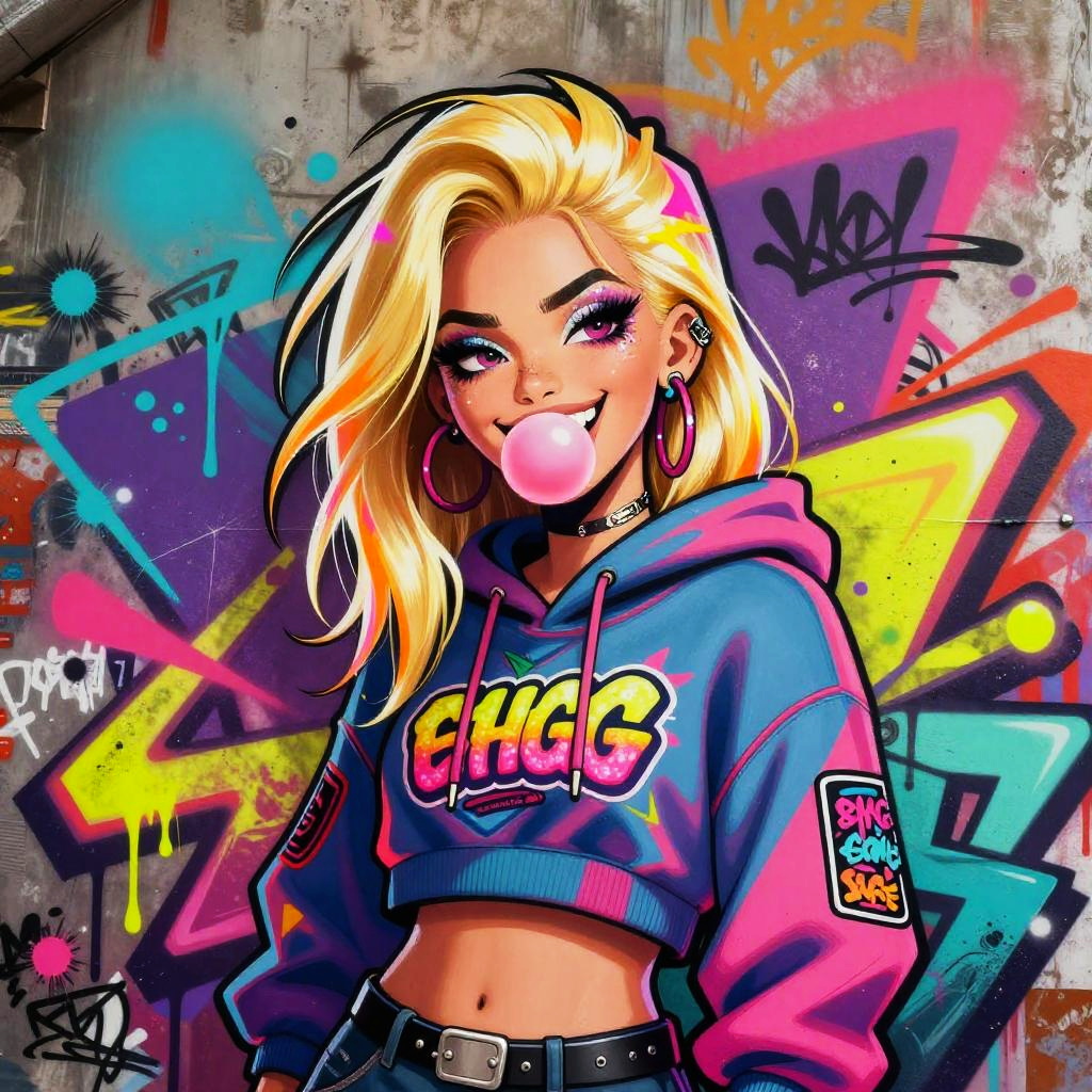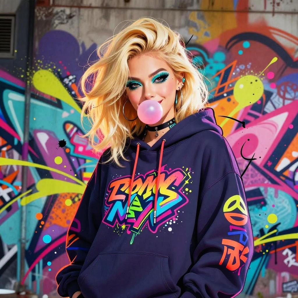 A vibrant, graffiti-style custom art piece of a female character with bubblegum-blonde hair, styled in an eye-catching, urban fashion. She has bright teal eyeshadow, sly smile, oversized graphic hoodie with a confident, streetwise vibe. The artwork features dynamic lines, neon accents, and bold, colorful shading, capturing a lively, rebellious energy. Set against a graffiti-style background with vibrant paint waves, dynamic spray splatters, blending urban art with a modern twist.