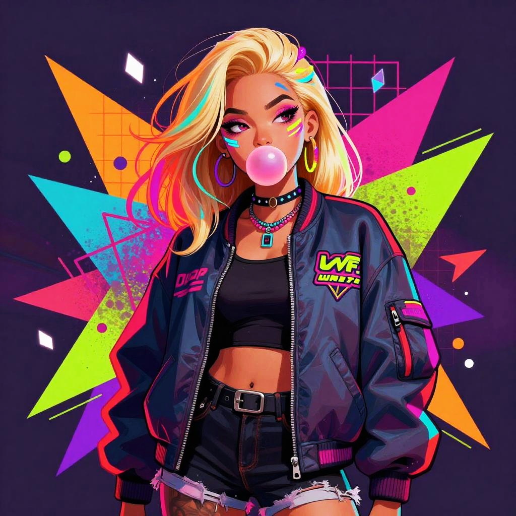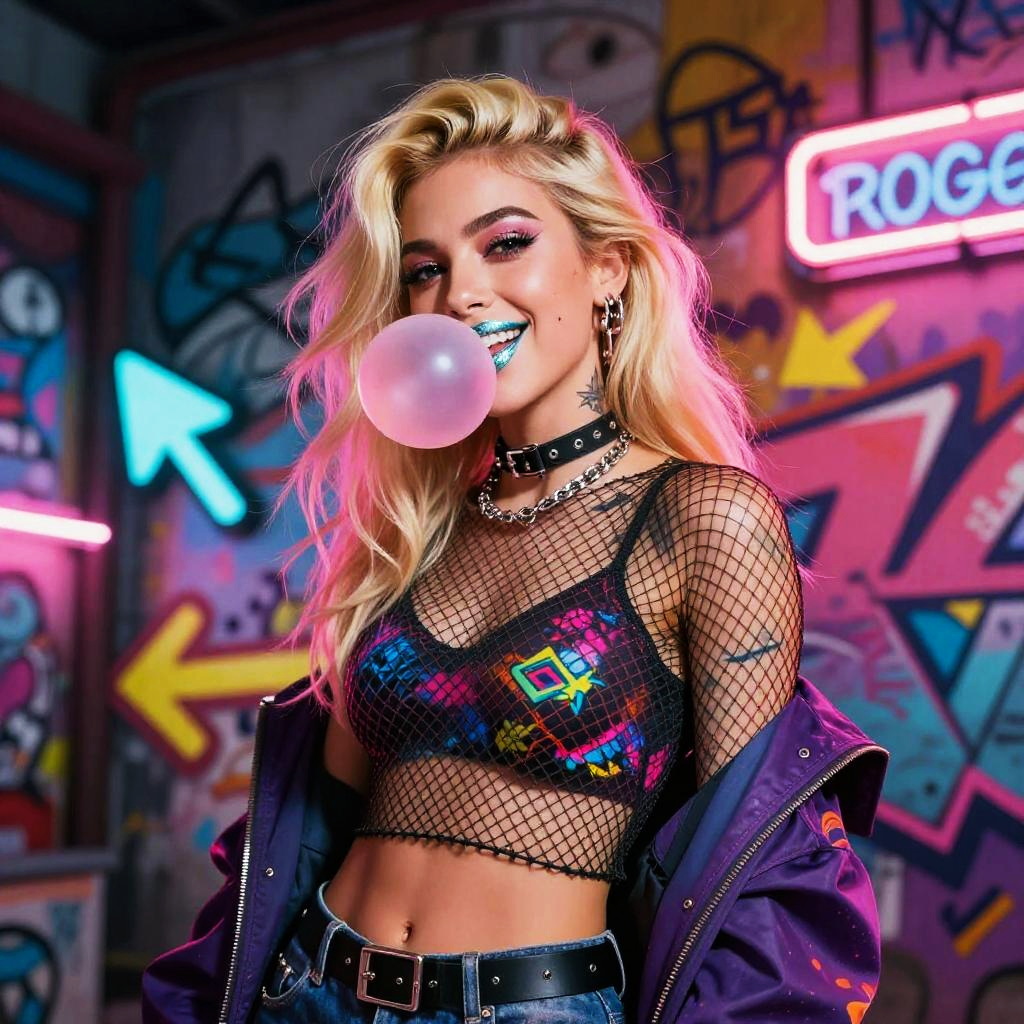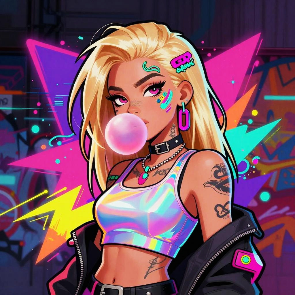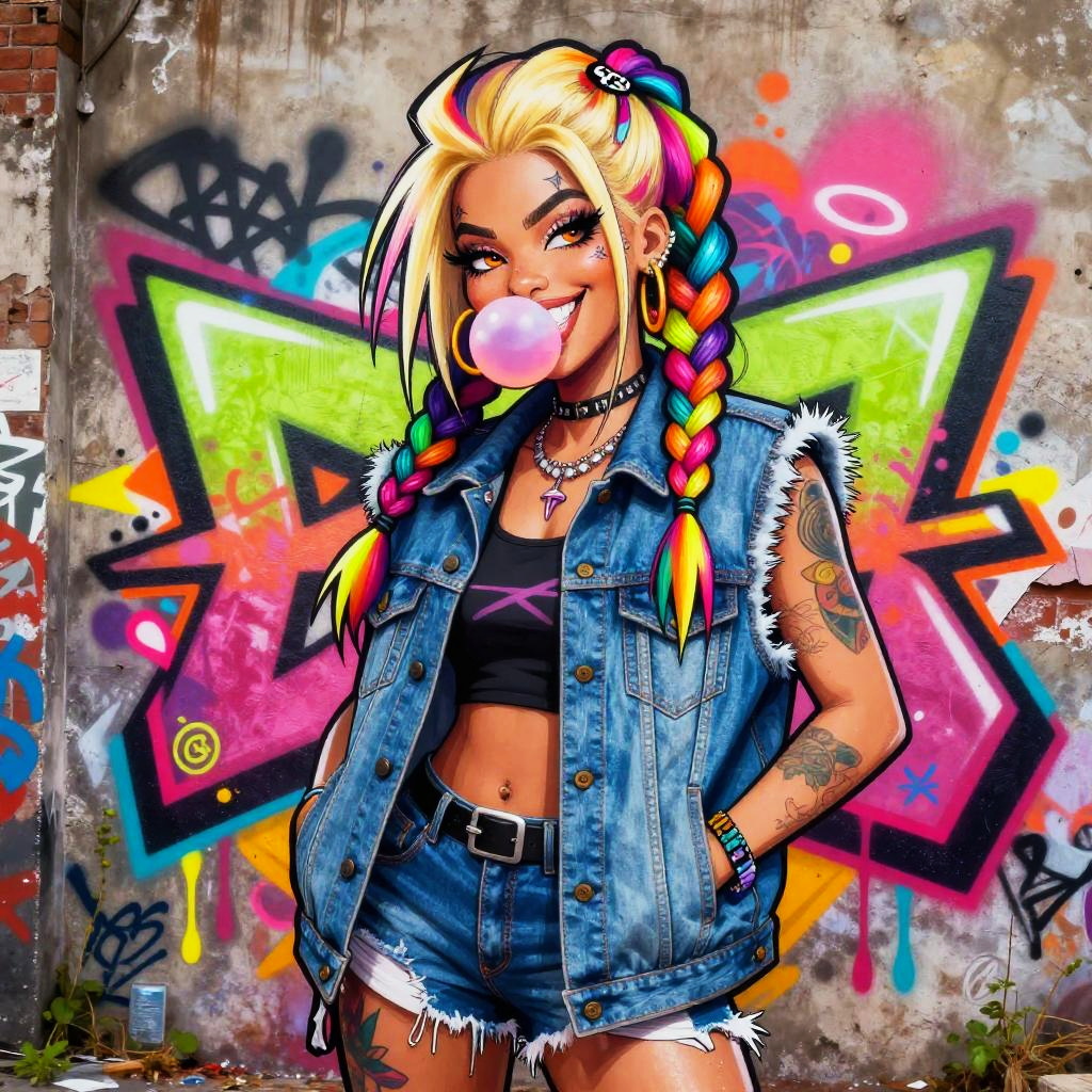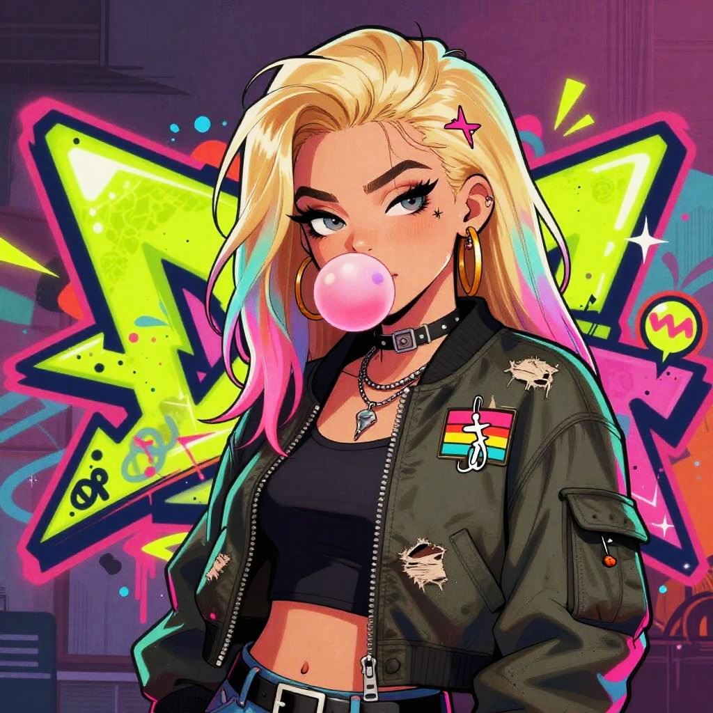 A vibrant, graffiti-style custom art piece of a female character with bubblegum-blonde hair, styled in an eye-catching, urban fashion. She has bright teal eyeshadow, sly smile, oversized graphic hoodie with a confident, streetwise vibe. The artwork features dynamic lines, neon accents, and bold, colorful shading, capturing a lively, rebellious energy. Set against a graffiti-style background with vibrant paint waves, dynamic spray splatters, blending urban art with a modern twist.