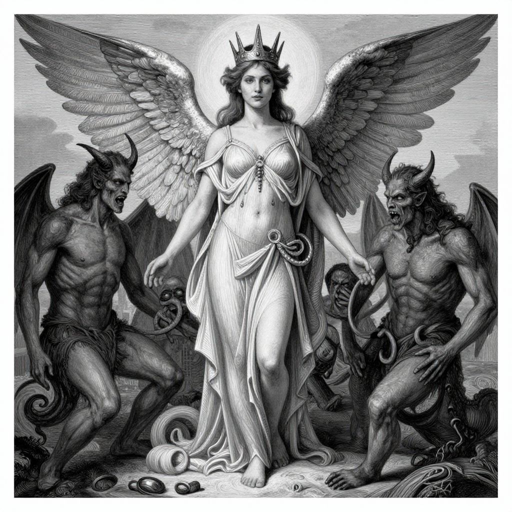 A black and white illustration depicts a woman with wings and a crown, surrounded by demons and monsters, reminiscent of Gustave Dore's \"The Seven Deadly Sins.\