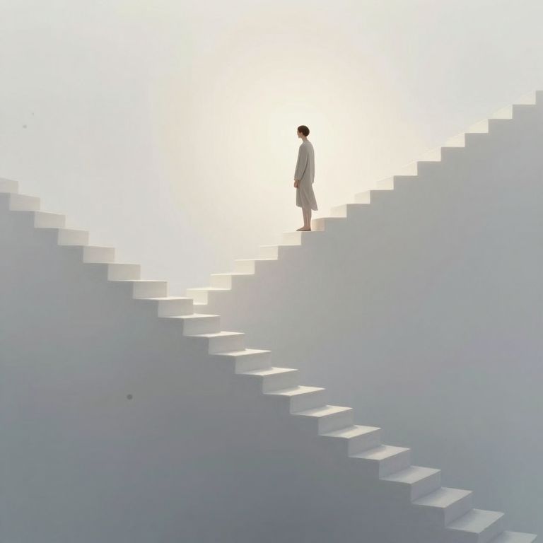 Ascending the ethereal staircase, a solitary figure embarks on a journey toward enlightenment, where each step dissolves the boundaries of gravity and reality, inviting introspection and the embrace of infinite possibility.