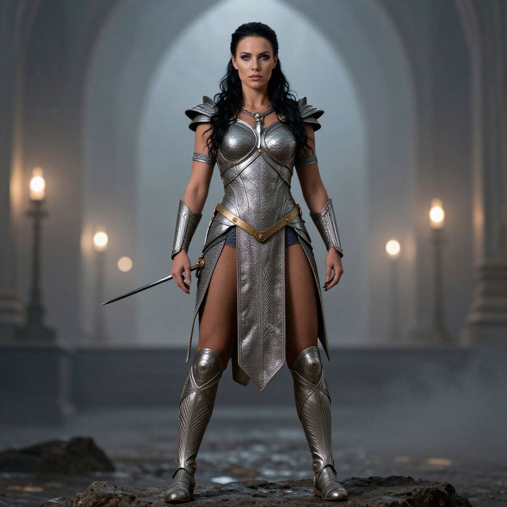 Photograph of a muscular blonde woman in silver armor with fur trim, standing confidently at sunset on a rocky mountain peak.