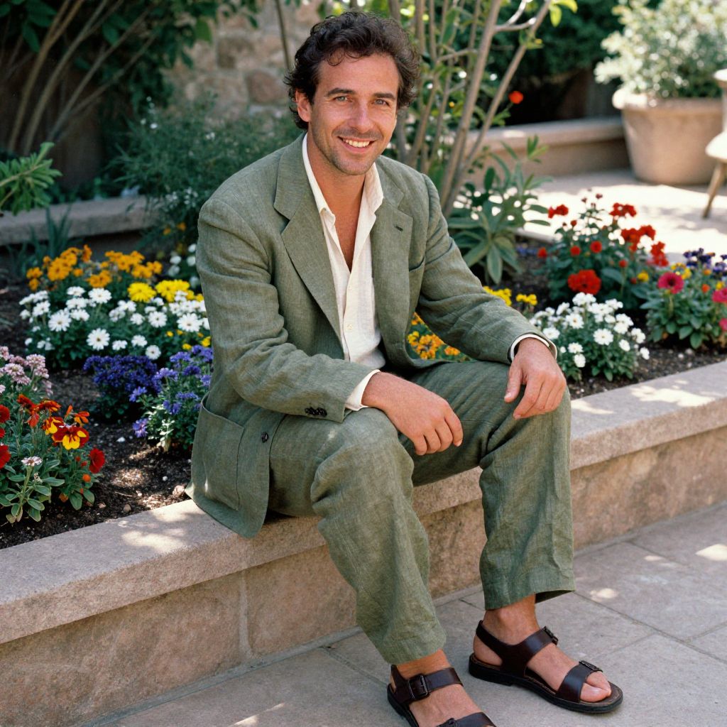 A man with masculine facial features and piercing eyes is seated outdoors on a stone ledge beside raised flower beds filled with colorful flowers. He is wearing an olive green linen suit, an off-white cotton shirt, and dark brown leather sandals. The setting is a sunny garden patio with natural greenery and vibrant blooms.