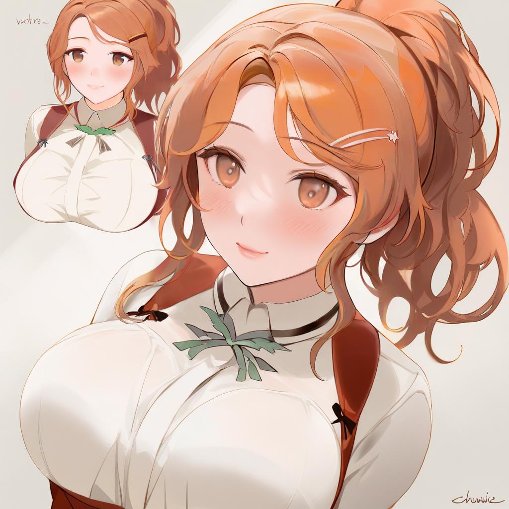 Aquila (kancolle), kantai collection, 1girl, brown eyes, yellow eyes, orange hair, long hair, wavy hair, high ponytail, ponytail, hairclip, large breasts, white shirt, by artist yepnean, illustrious