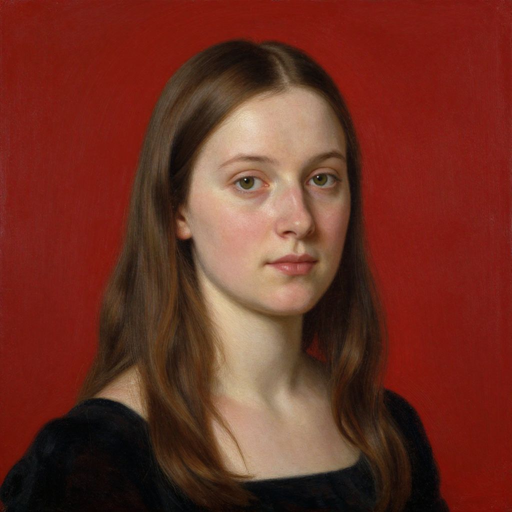 This photograph-like digital painting portrays a young Caucasian woman with fair skin and long, straight brown hair. She has a slender face with subtle freckles, light green eyes, and a neutral expression. She wears a simple black top with a round neckline. The background is a solid, vibrant red, which contrasts with her pale complexion and dark hair. The lighting is soft, highlighting her facial features and creating gentle shadows. The overall style is realistic, capturing intricate details and textures, especially in her hair and skin. The composition focuses on her upper body, centered within the frame.