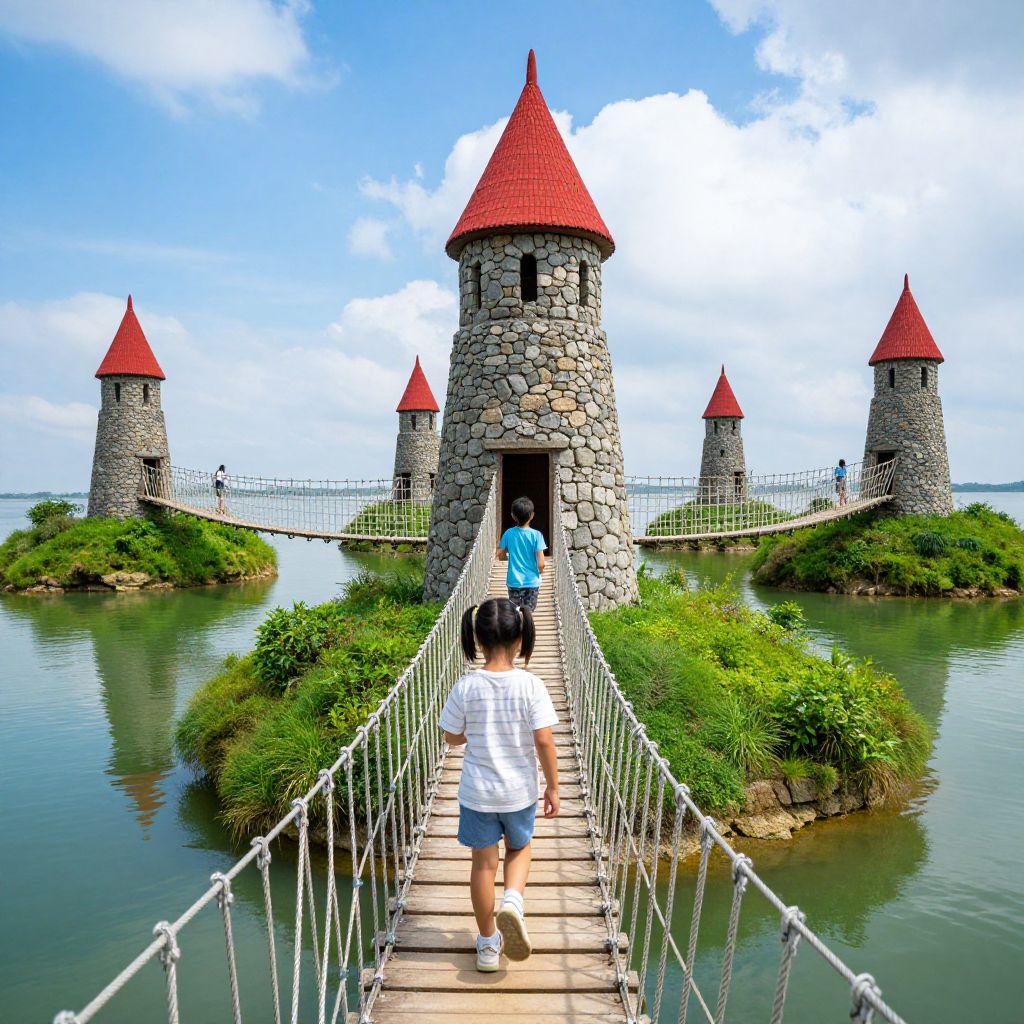 Children traverse wooden rope bridges connecting vibrant green islands, each crowned with stone towers featuring red conical roofs, under a bright blue sky dotted with fluffy white clouds.