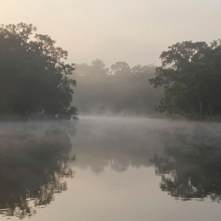 Photograph of a serene, mist-covered river surrounded by lush, green trees under a bright blue sky with scattered clouds.