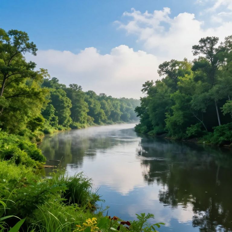 Mississippi river winding through lush green forests under a bright blue sky, detailed reflections on the water, cinematic lighting, vibrant colors, high resolution, peaceful and serene atmosphere, early morning mist