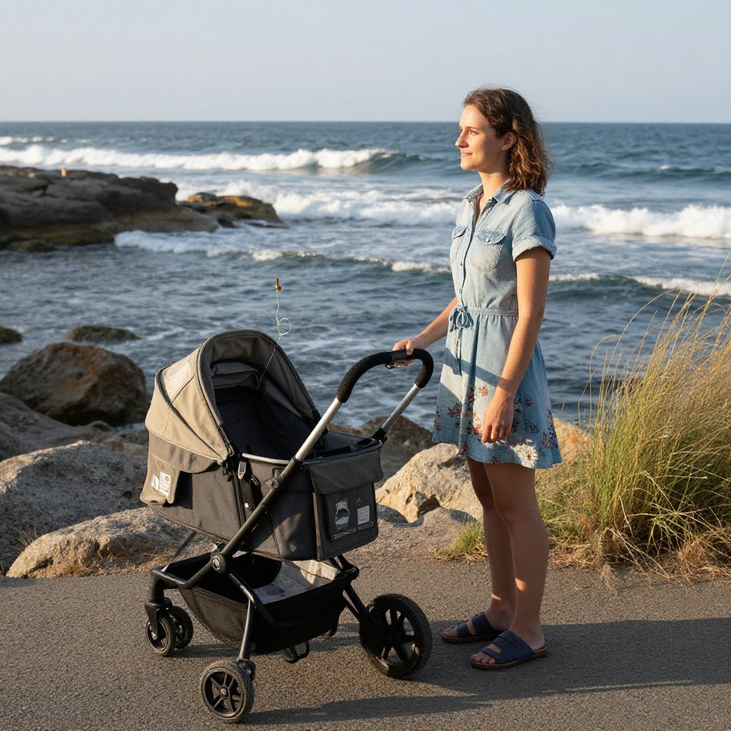 A woman in a sun-bleached denim and floral casual dress stands beside a seashore stroller parked near a rocky shoreline, the stroller has a canvas cover with patches and a small fishing line tied to a wooden hook, the setting is a quiet cove with sea foam and ruffled grass, the woman has fair skin, a friendly smile, and her eyes are focused on the ocean waves with quiet reflection, soft afternoon light casting long shadows