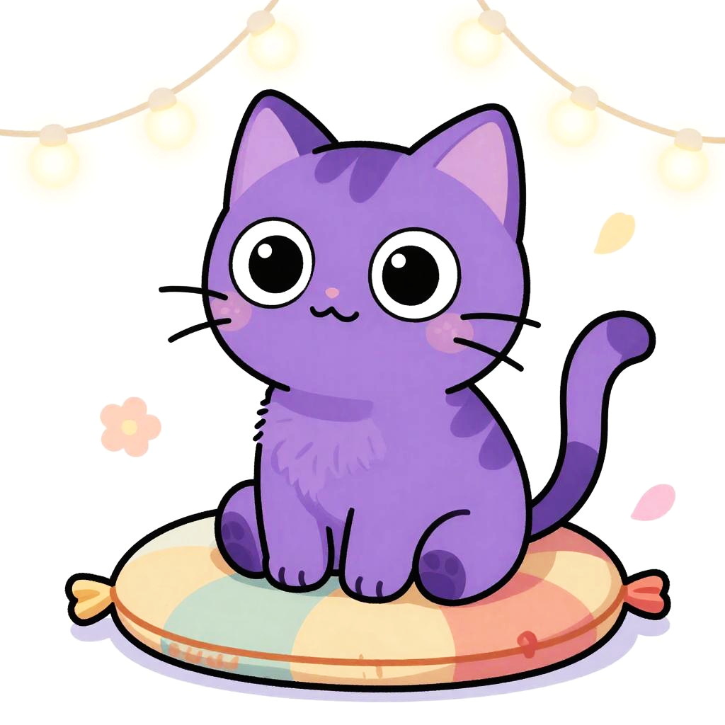 Adorable, cartoon-style purple kitten with large black eyes and a smiling face, sitting on a colorful, circular pillow, against a white background with soft