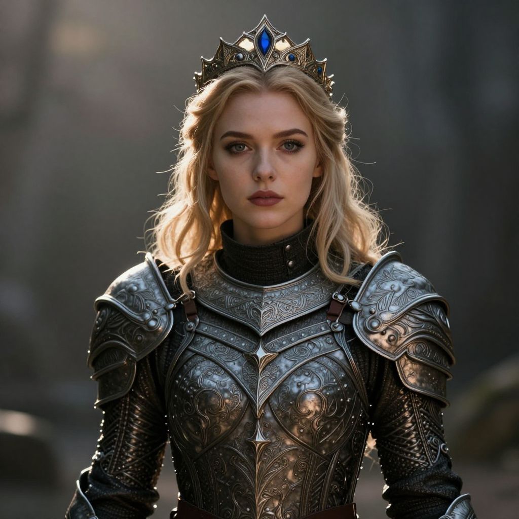 Photograph of a young woman with fair skin and long, wavy blonde hair wearing a silver, intricately designed crown adorned with a blue gem. She has blue eyes and a serious expression. She is dressed in ornate, silver medieval-style armor with detailed patterns and a high collar. The background is blurred, with dark, muted colors suggesting an outdoor, possibly forested, setting. The lighting highlights her face and armor, creating a dramatic, heroic appearance. Her armor covers her chest and shoulders, with visible textures and engravings. The overall style is regal and fantasy-like.