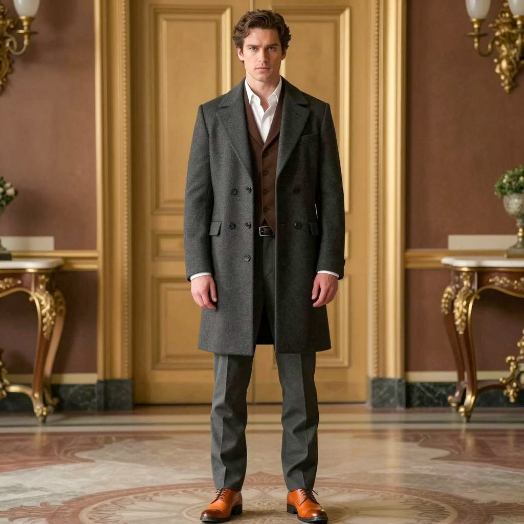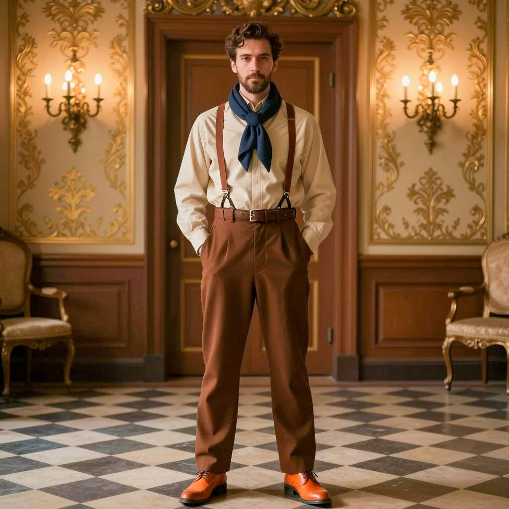 Joe brown costume, photorealistic, man standing in ornate room, vintage clothing, brown trousers with suspenders, beige button-up shirt, dark blue scarf, brown belt, orange shoes, hands in pockets, serious expression, dark hair, beard, decorative gold wallpaper, chandeliers, checkered floor, rich ures, warm lighting, historical, mid-20th century style, detailed background, realistic rendering, T2I generated image, full body shot, front view, centered subject, formal setting
