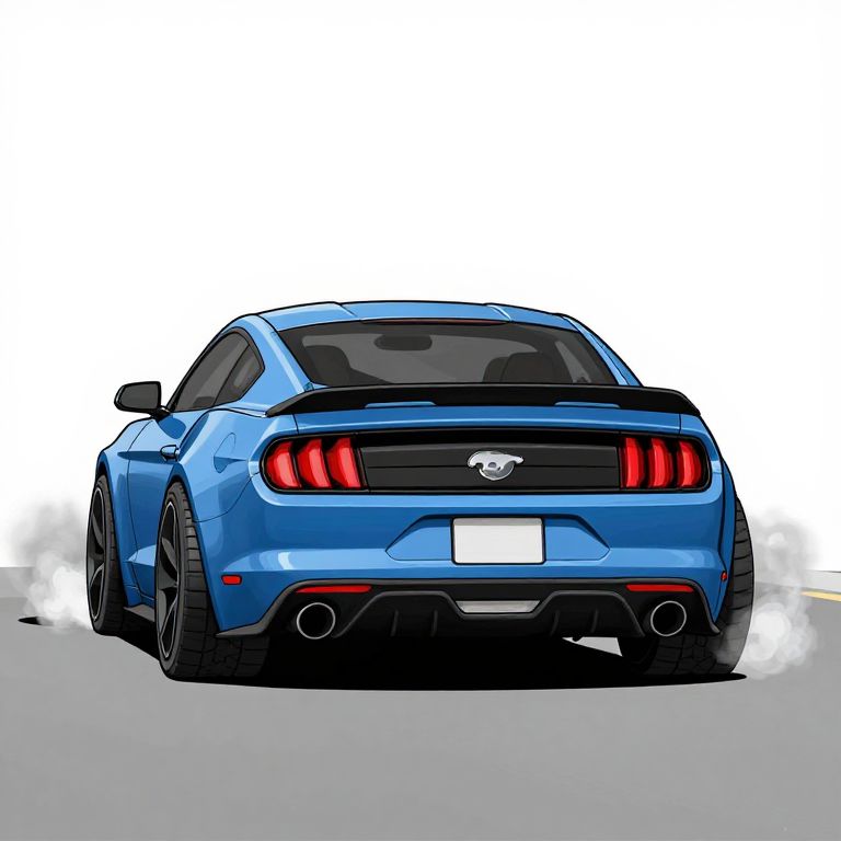 Silk 3/4 view forward facing cartoon ford mustang with over exaggerated rear tires and smoke coming off the rear tires,