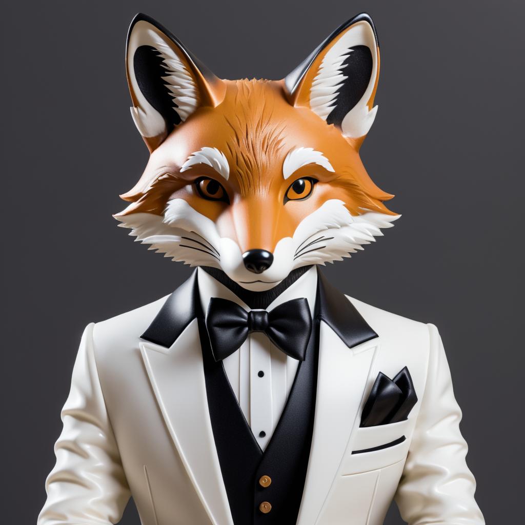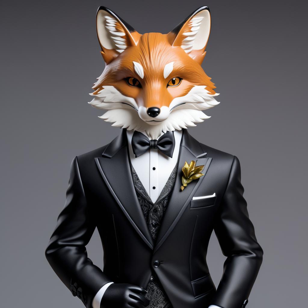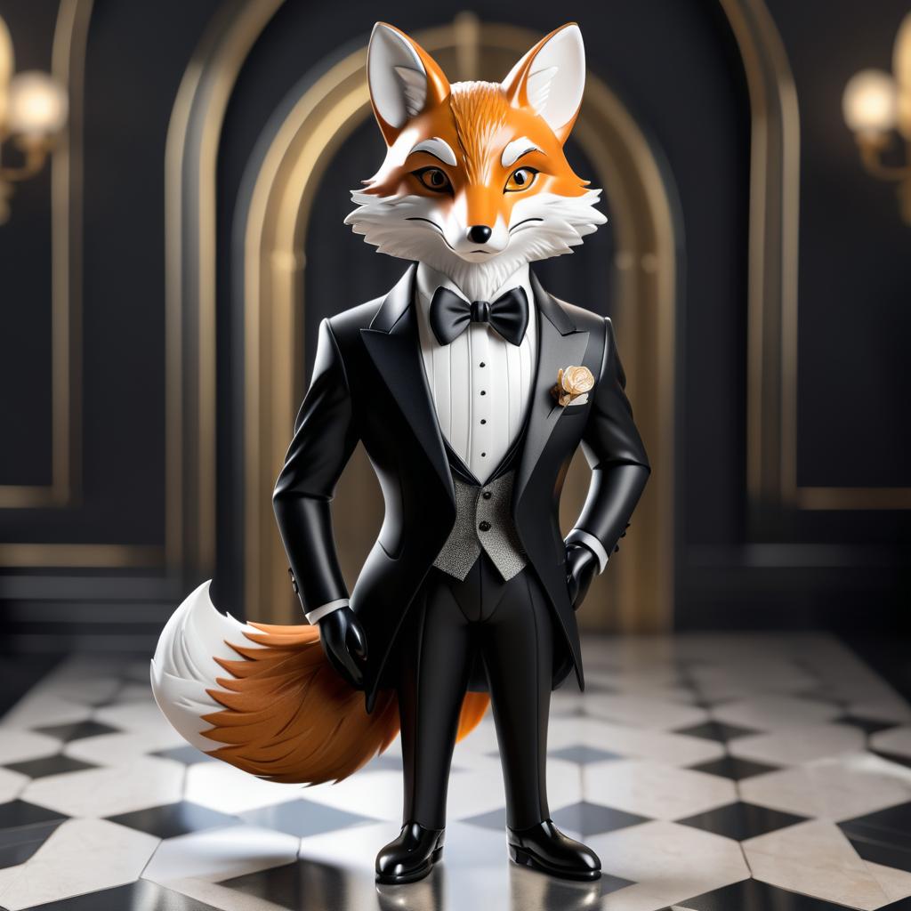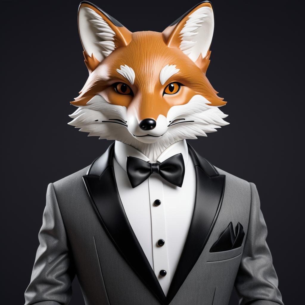 Anthropomorphic fox in a tuxedo, highly detailed and styled with a professional and formal look.