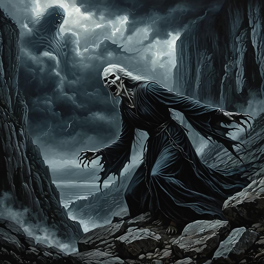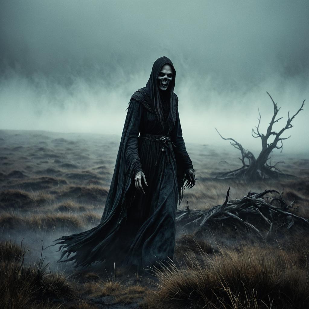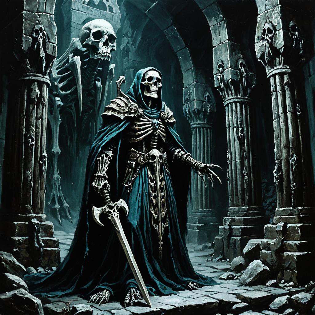 A dark fantasy painting of an undead warlock clenching a glowing tome lurking in a desolate battlefield littered with bones, with ominous dread adding to the sinister atmosphere.