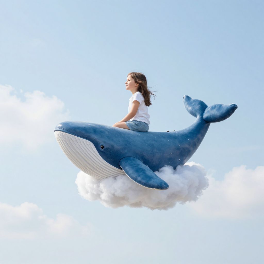 Amidst a boundless expanse of serenity, a child perches atop a whimsical cloud-whale, embodying the purest form of freedom and wonder, as the gentle hum of the sky whispers tales of infinite possibility.