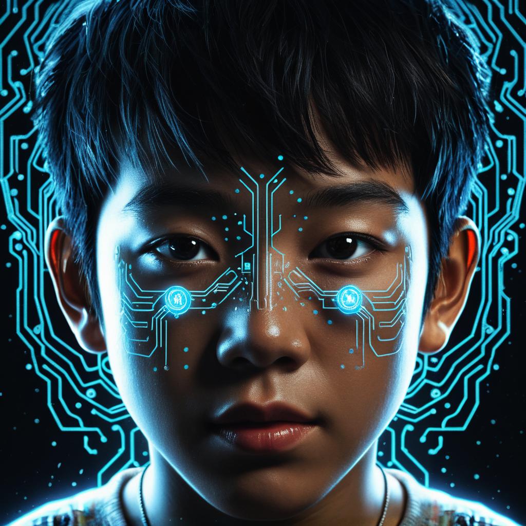 Detailed digital artwork featuring a close-up portrait of an Asian boy with glowing blue electronic circuits integrated into his face, resembling laser beams and liquid ferrofluids. The futuristic theme is enhanced with neon blue lighting and circuit patterns, rendered in a highly detailed and intricate style inspired by art nouveau and sci-fi digital art trends.