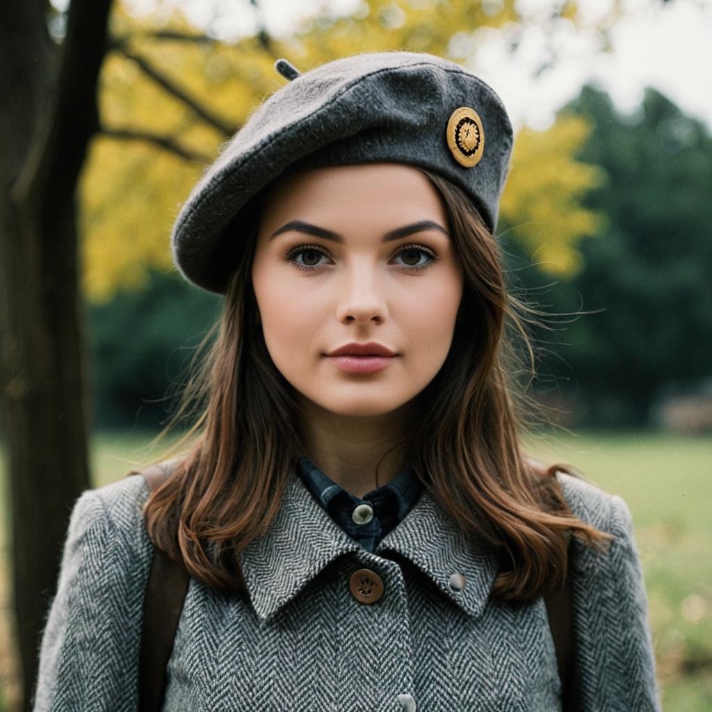 Portrait of a young woman with long brown hair and grey eyes wearing a grey beret with a gold button and a matching grey buttoned coat. She is outdoors with a blurred background of trees and greenery, captured in natural daylight with a soft depth of field.