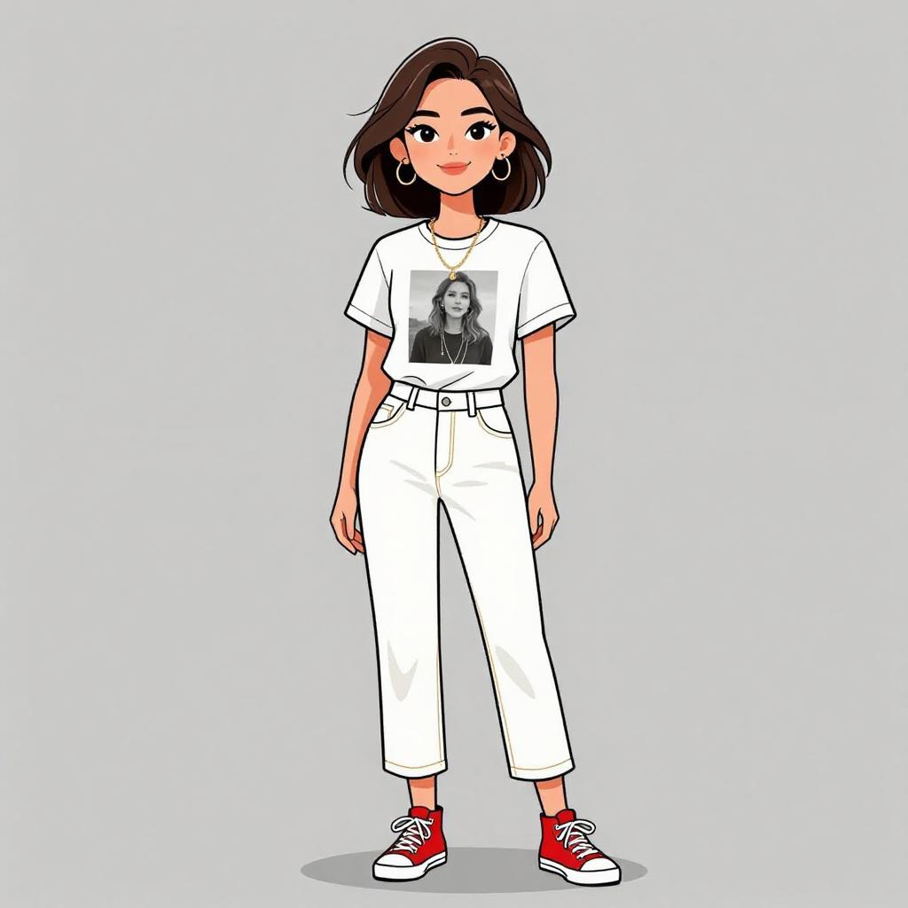 Digital cartoon of a young woman with medium-length dark hair, wearing a white t-shirt with a black-and-white photo, white pants, and red sneakers