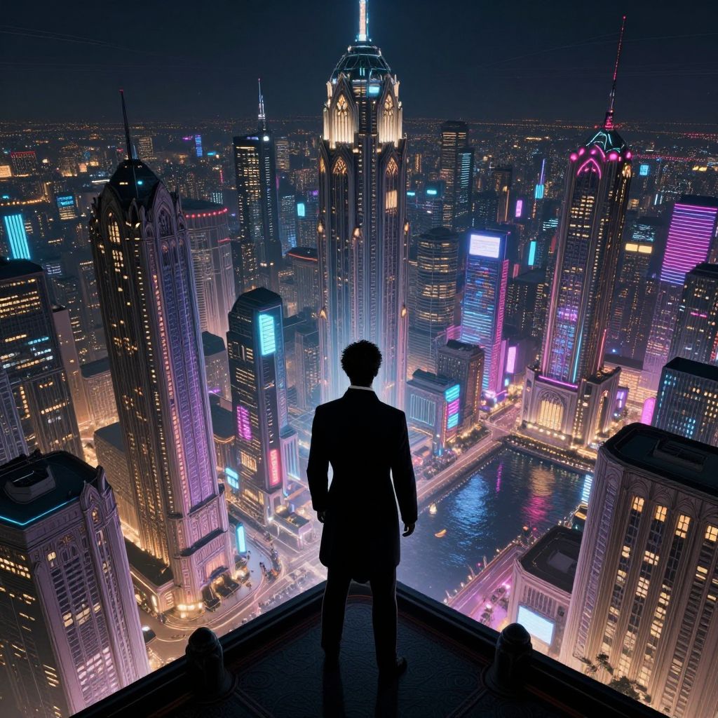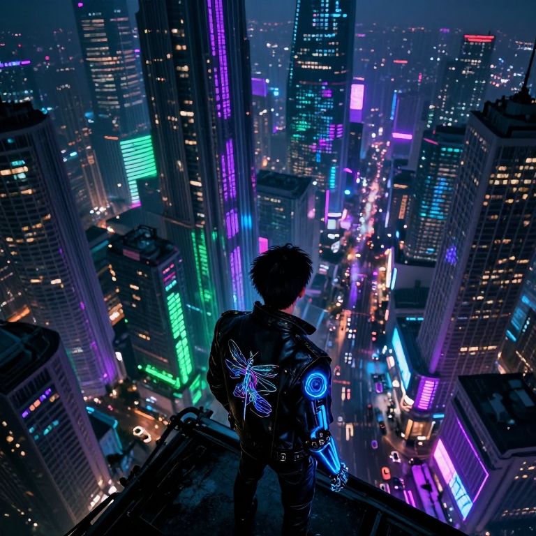 From an aerial vantage point, akin to a dragonfly's meticulous gaze, a sprawling futuristic cityscape unfolds. This vista, populated with towering skyscrapers and rain-drenched streets, is illuminated by vibrant neon lights in electric hues - purples, blues, and greens that dance like abstract brushstrokes on the urban landscape. In this bustling metropolis, technology intertwines harmoniously with raw, gritty reality, casting a spell of allure and danger that suffuses every corner. The scene centers around a solitary figure clad in a black leather jacket embellished with holographic designs, their cybernetic limb pulsating with an eerie blue glow - a symbol of the future amidst the tumult of the present. This image embodies both the charm and trepidation inherent to technological advancement, interweaving elements of advanced technology with a tangible sense of urban decay, inviting the viewer into a world that is at once familiar yet utterly alien.