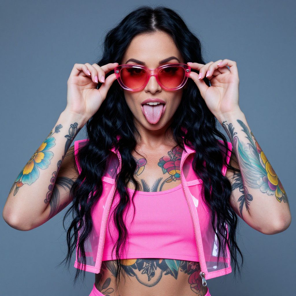 Photograph of a tattooed woman with light brown skin and dark hair pulled back. She's wearing a white crop top, showing off colorful tattoos on her arms and chest, including a large butterfly on her neck. She's holding her finger to her lips, giving a sultry look. The background is plain white, and she's wearing large hoop earrings. The image has a high contrast, almost neon-like lighting.
