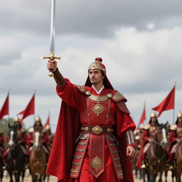 Warrior clad in vibrant red robes and ornate armor stands resolute, gripping a gleaming sword aloft, as a procession of mounted soldiers and fluttering red banners march behind him under a cloudy sky.