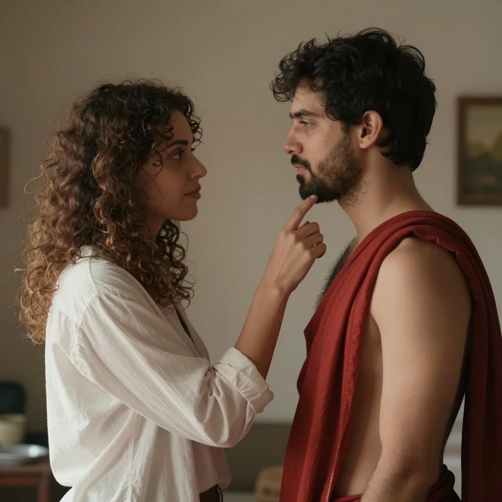Two people standing under a shower. The man on the left, with dark hair, wears a colorful shirt and an orange towel around his neck, holding a yellow object to his ear. The woman on the right, with a teal turban, wears a beige jacket over a patterned top, laughing with her hands raised. Water streams down from above, illuminating the scene. Background includes blurred lights and walls.