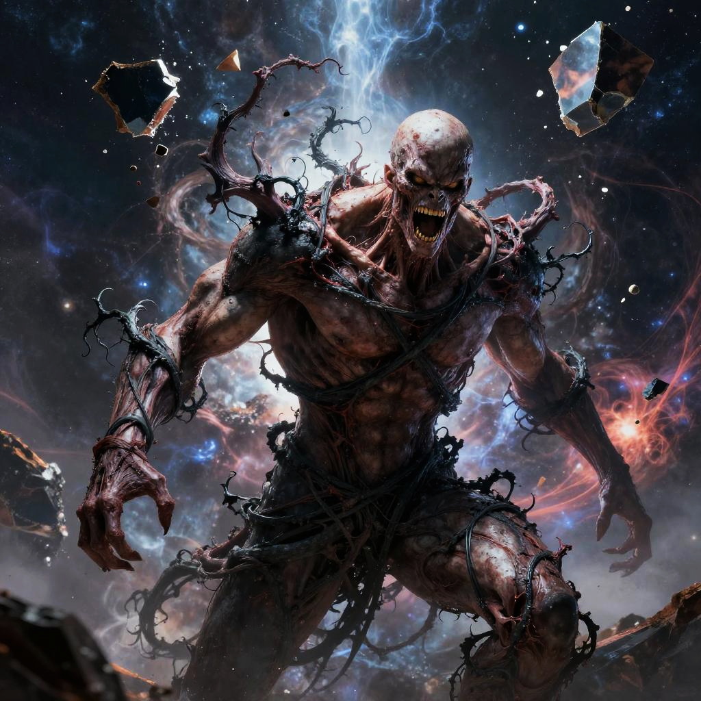 Berserk void body emerging from a rift in space, tendrils of black energy wrapping around a muscular form, fragments of shattered reality floating, intense fierce expression, cosmic storm backdrop, detailed textures, vivid colors blending darkness and light