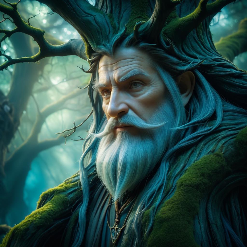A close-up digital fantasy illustration of a wise old tree spirit with a human-like face and long beard integrated into the trunk of a large tree. The scene is set in an enchanted forest with serene, moody lighting and ethereal glowing orbs in the background, evoking a mystical atmosphere inspired by J.R.R. Tolkien and Brian Froud.