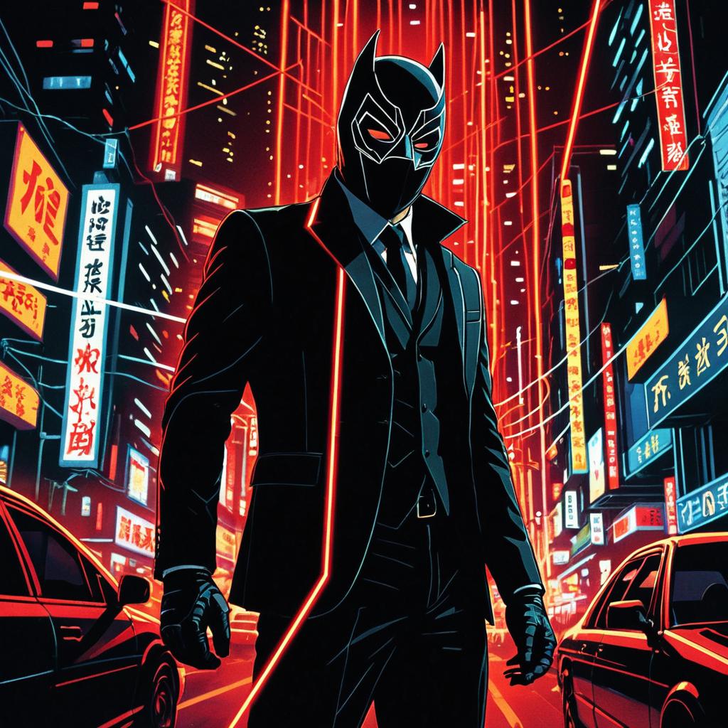 A masked vigilante wearing a sleek black suit with glowing white lines stands prominently against a neon-lit urban cityscape at night. The dramatic scene includes swirling smoke and bright light trails, emphasizing an action-packed, stylized atmosphere inspired by Masakazu Katsura's drawing style.