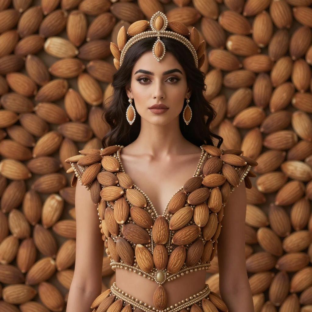 A stunning artistic portrayal of a woman adorned in a richly textured outfit made of almond-like shapes, emphasizing natural elements and intricate design. The background's plethora of almonds complements her elaborate headpiece, creating a harmonious and visually striking composition.