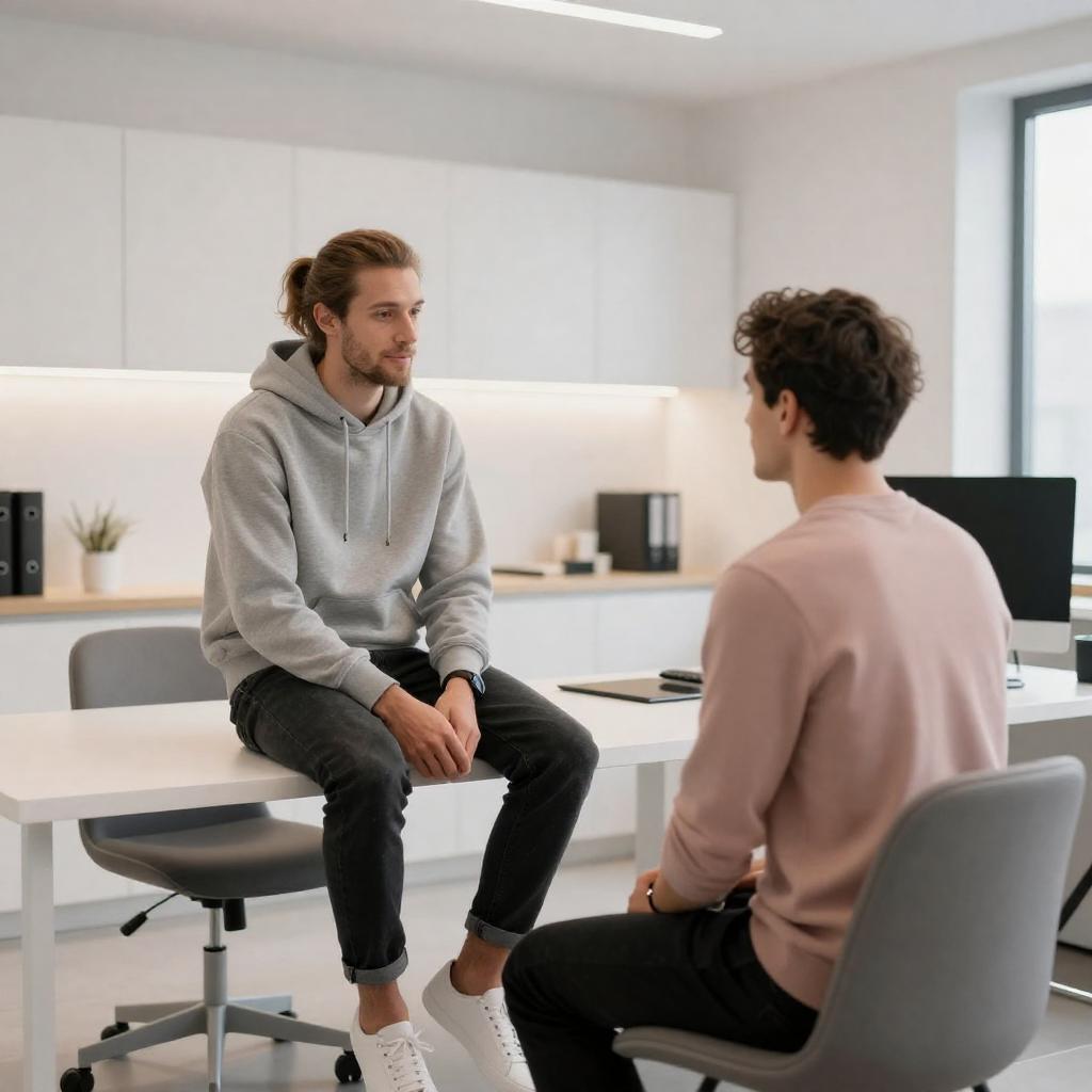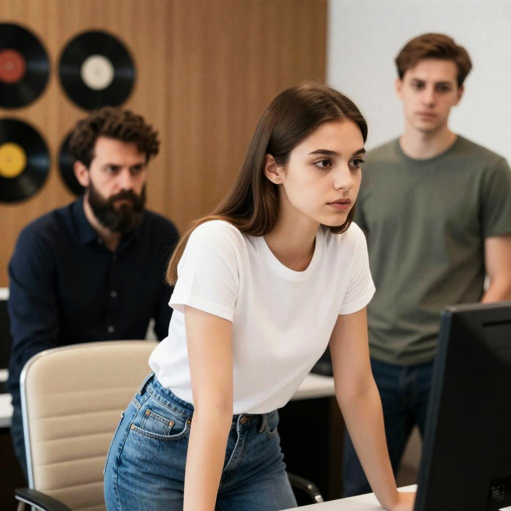 Three people in a kitchen. Central woman with brown hair, brown hoodie, turns back, smiling. Man on left, blue shirt, focused. Woman on right, blonde hair, green shirt, writing. Yellow bottle, coffee cup, papers on counter.