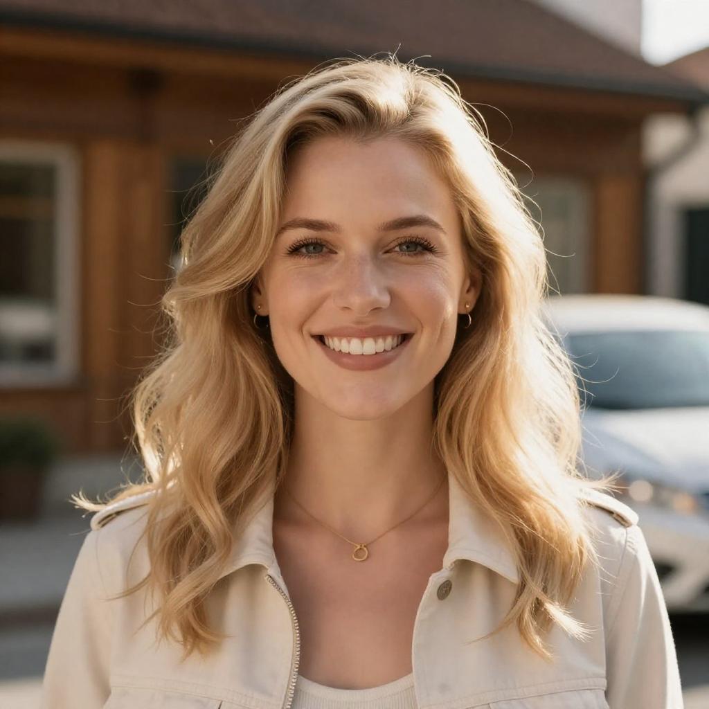 Photograph of a smiling blonde woman with wavy hair, wearing a light-colored jacket. Background includes a blurred wooden building and a white car. Sunlight illuminates her face and hair. She is centered, facing forward.