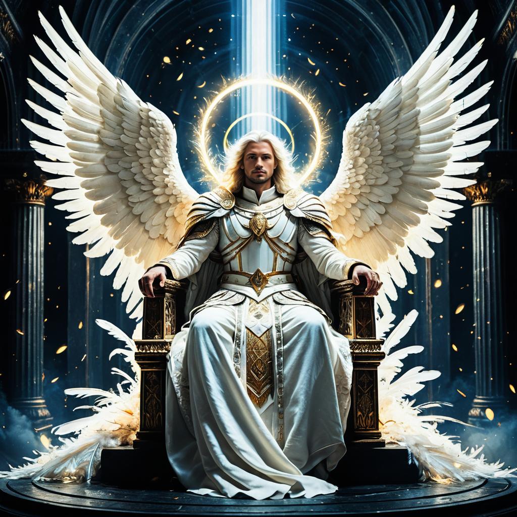 High-quality digital art depicting a grand celestial palace interior with tall, ornate columns. A radiant angelic figure with large white wings and silver armor hovers above a staircase, bathed in divine light. Below, a cloaked warrior in dark blue with gold details faces the angel. Rows of armored celestial warriors with horned helmets and swords stand on either side of the stairway in a symmetrical formation. The scene embodies a divine, fantastical atmosphere with intricate armor and flowing capes.