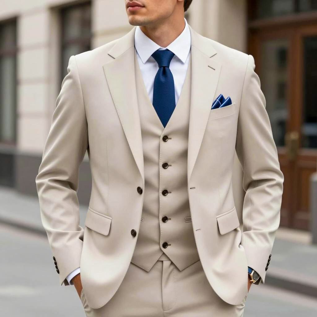 Close-up photograph of a man wearing a light beige three-piece suit with a matching vest, white dress shirt, and dark blue tie. The suit features a light blue pocket square and the man has his hands casually placed in his pockets. The setting is urban with blurred background, captured in daylight with sharp focus, highlighting a modern and sophisticated fashion style.