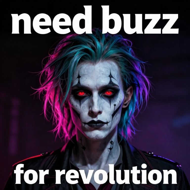 Photograph of a pale, androgynous person with neon blue and pink hair, glowing red eyes, and white face paint with black star-like marks. Their dark lips are painted black. They are wearing a black leather jacket with visible studs. The background is dark, highlighting the neon colors. Bold white text at the top reads "need buzz" and at the bottom reads "for revolution." The overall style is dramatic and edgy, with a futuristic, cyber-punk aesthetic. The image has a digital, high-contrast effect.