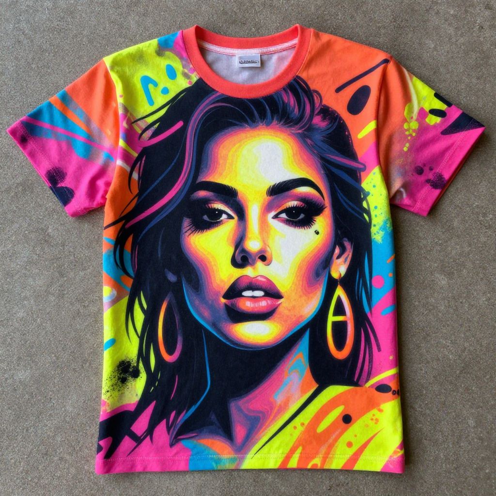 A vibrant graffiti-inspired t-shirt design featuring a woman's face with bold, neon colors and abstract patterns.