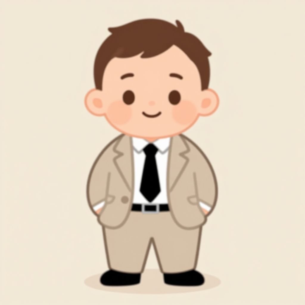 This is a digital cartoon drawing of a chibi-style man with a round, childlike face, light skin, and short brown hair. He has black circular eyes and a small, smiling mouth. He is wearing a beige suit with a black tie and white shirt, and black shoes. His hands are in his suit pockets. The background is plain white, making the character the focal point. The overall style is cute and simplistic, with bold, clean lines and solid colors.